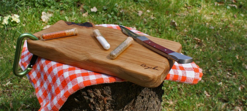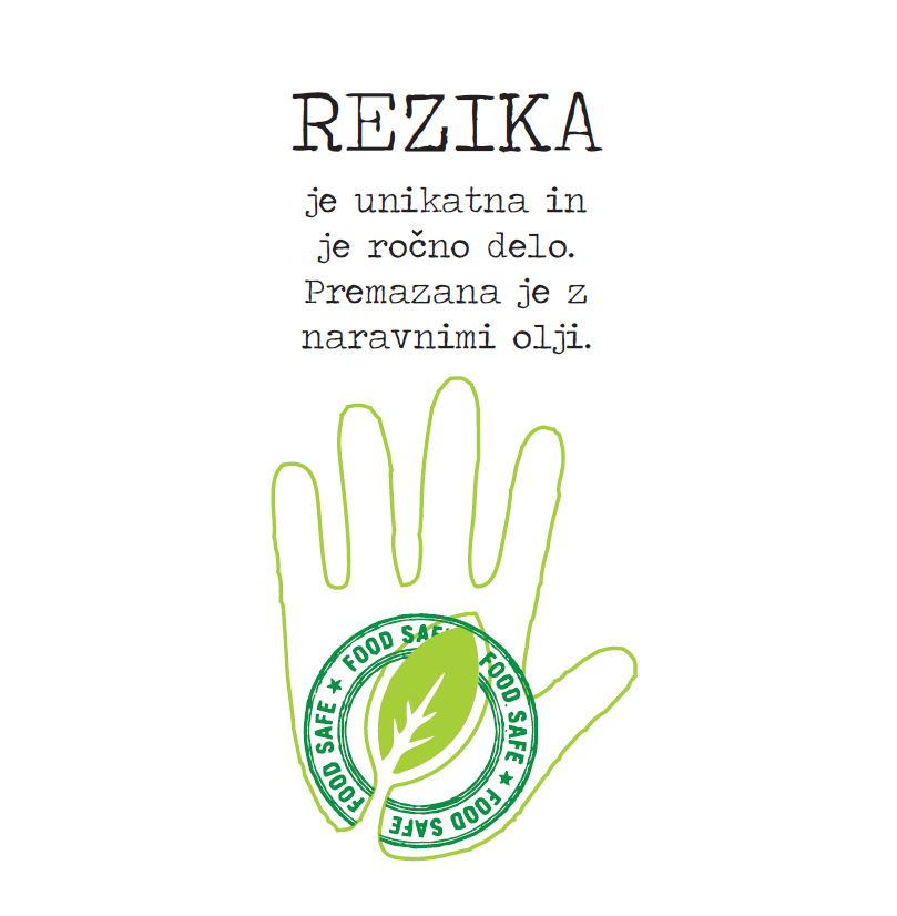 Rezika je unikatna lesena deska, ročno izdelana v majhni domači delavnici sredi kozjanskih gričev. Zamisel za Reziko se je porodila kot darilo ljubljeni osebi, ki svoj prosti čas rada preživlja na prostem, sčasoma pa je prerasla v poslovno idejo, ki navdušuje ljubitelje narave in aktivnega oddiha. Iščete unikatno in praktično darilo za popotnika, planinca, plezalca, avanturista ali terenskega delavca? Podarite mu REZIKO! Za simpatičnim imenom se skriva ročno izdelana deska unikatne oblike, ki jo lahko spravite v nahrbtnik ali jo ponosno obesite na vidno mesto v svojem bivalniku, letni ali domači kuhinji. Vsaka REZIKA vključuje zložljiv nož in tri epruvete z začimbami. Izdelana je iz kakovostnega slovenskega lesa in zaščitena samo z naravnim oljnim premazom. ZAKAJ IZBRATI REZIKO? Ker je prav vsaka unikat in vsaka govori svojo zgodbo. Ker ni le deska - ima integriran zložljiv nož in tri epruvetke, namenjene za shranjevanje najljubših začimb. Ker je izdelana le iz kvalitetnega slovenskega lesa nadzorovane sečnje in je zaščitena z naravnimi olji in voski. Skrbno izbran les, nadzorovana sečnja, kakovostna izdelava,unikatna obdelava Podprimo lokalno obrt in slovensko kvaliteto. 100% naravna zaščita lesa. Rezika je vedno impregnirana s trajnimi premazi iz naravnih olj in voskov. Rezika vedno ohranja lepo in živo barvo lesa. Zložljiv nož kvalitetne izdelave, se po uporabi skrije v notranjost REZIKE in je tako vedno pripravljen za naslednjo popotniško malico. Epruvete so narejene v Sloveniji. Hrani prijazna, 100% reciklirana plastika, zamašek iz plute. Personalizirane gravure, ki bodo unikatni REZIKI dale še bolj osebno noto.![]()